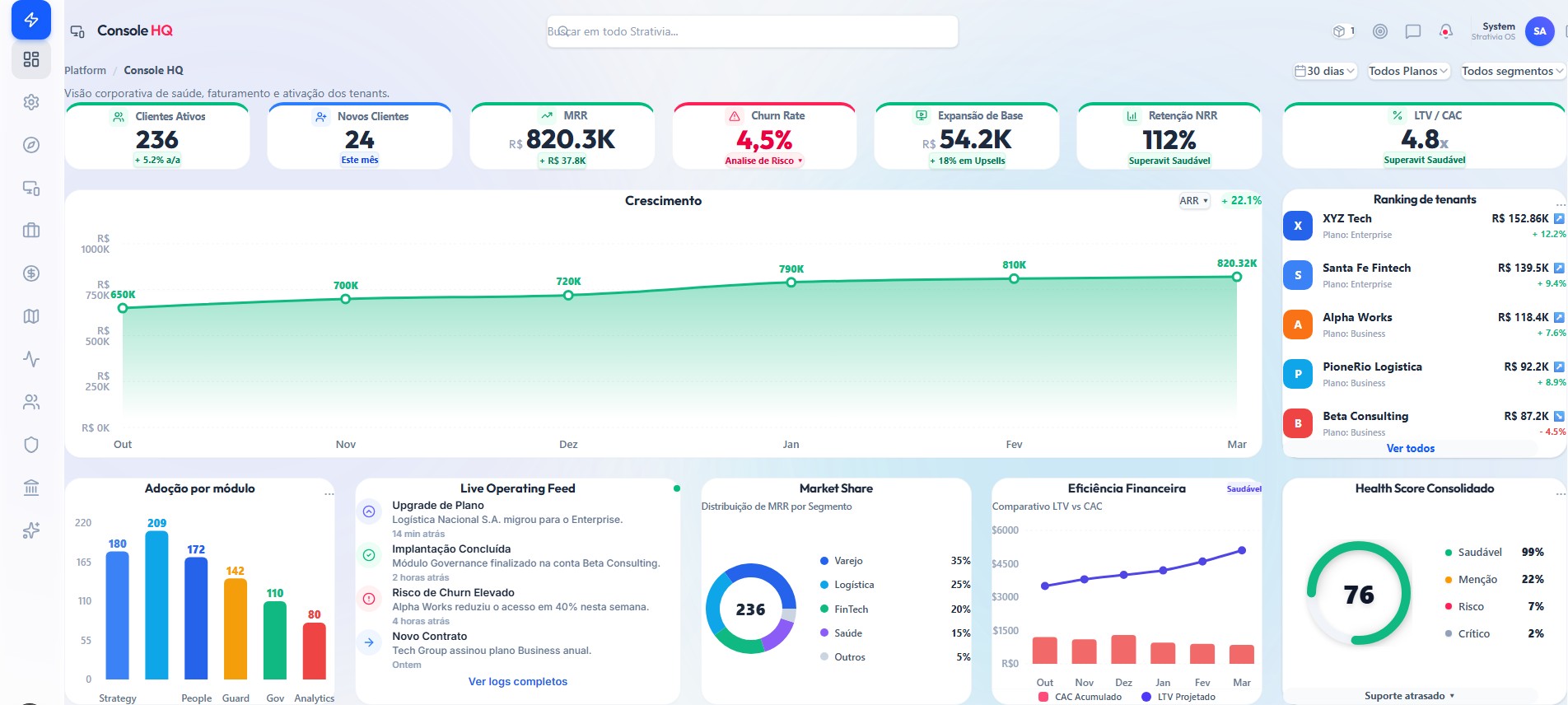 Inteligência competitiva conectada. Compara os seus indicadores (CAC, Churn, Margem) de forma anônima com a base global da Strativia, revelando se você está no cobiçado quartil superior (P90) do seu setor.